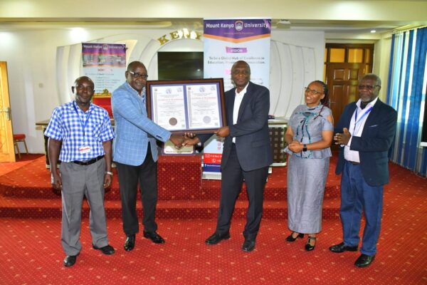 MKU Vice- Chancellor, Prof Deogratius Jaganyireceiving interactive display units from the Chairman Board ofDirectors and Founder MKU, Prof. Simon Gicharu. The universityhas embraced ICT and digital teaching and learning technologiesas a driver to digital transformation.MKU offers her programmes both face- to-face and through arobust online learning platform. PHOTO: By James Wakahiu Mount Kenya University (MKU)…
