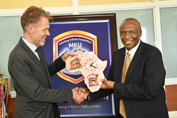 Photo/Germany’s Deputy Ambassador to Kenya Mr Alexander Fierley (left) gets a gift from MKU VC Prof Deogratius Jaganyi during a visit by a high powered delegation from the German embassy in Nairobi to MKU Thika Campus. The German government and German institutions continue to partner with MKU in training of assistant nurses in preparation for…