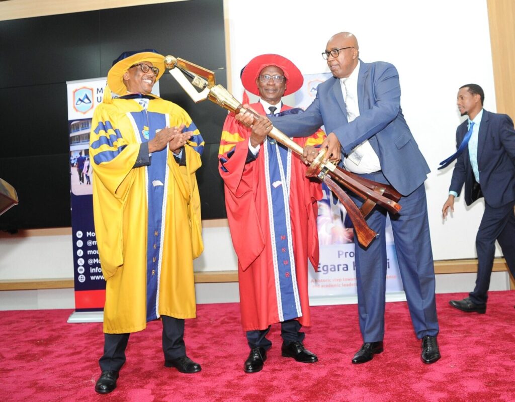 Photo/Chancellor Prof Egali Kabaji receiving instruments of power from Prof Simon Gicharu